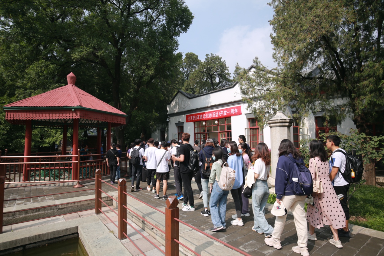 初心不改启新程,使命不怠再出发。考察团的第一站是位于香山脚下的香山革命纪念馆。香山革命纪念馆于2019年9月起正式对外开放,是集中展示香山革命历史的重要场馆,馆内设立的《为新中国奠基-中共中央在香山》基本陈列展是目前国内唯一全面展示中共中央进驻香山时期辉煌历史的大型展览。在观看展览的过程中,同学们系统回顾了从进京“赶考”、进驻香山、继续指挥解放全中国到新中国筹建、再到“不忘初心,牢记使命”的革命历程,纪念馆内珍藏的各类史料和纪念品让同学们深刻体会到了革命前辈留下的红色印记,也让同学们以更加坚定的信念向着实现中华民族伟大复兴的宏伟目标奋勇前进。