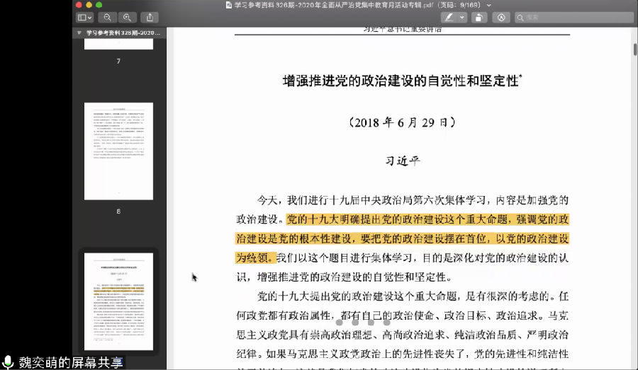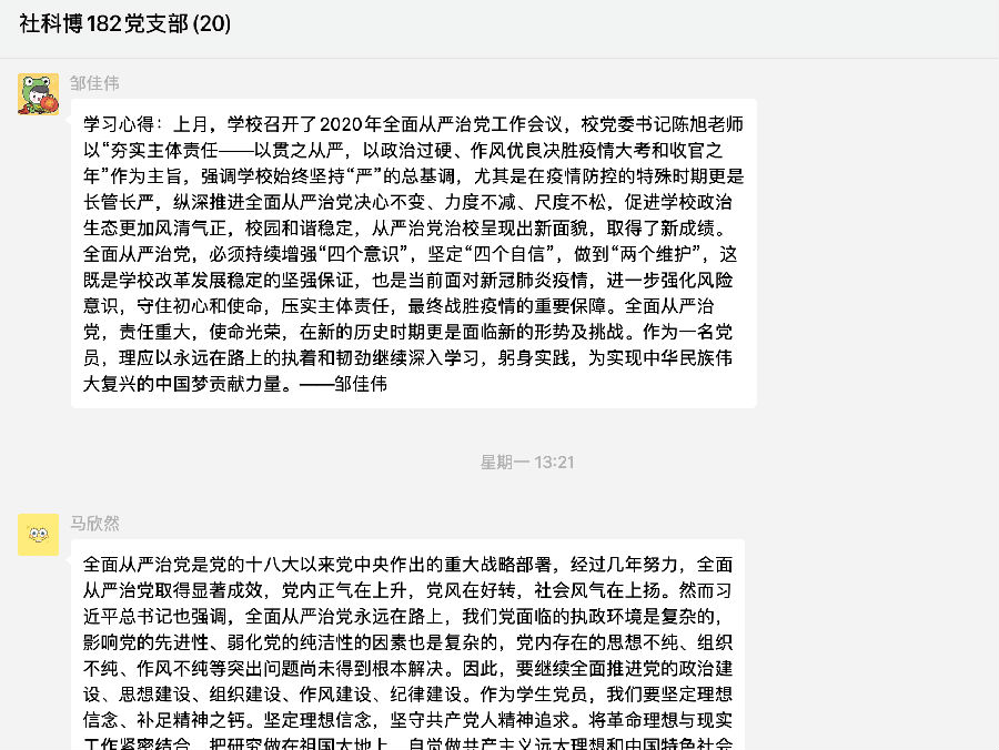 2020年6月17日晚上7点,社科博182党支部通过线上会议的方式开展了本学期最后一次党组织生活。本次组织生活以“全面从严治党”为专题,邀请了公司党委委员孙沛老师、博士生讲师团金牌讲师陈弱霄同学参与分享和交流。