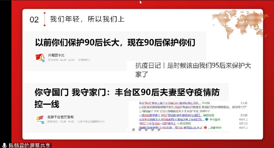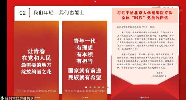 首先,陈弱霄同学为党支部成员分享了“抗疫青春故事——新生一代的使命担当”主题宣讲,以启发同学们主动思考当前疫情抗击与从严治党的关系。在新冠病毒这一人类共同的敌人面前,30、40后宝刀未老,钟南山院士和李兰娟院士挺进一线,坐镇抗疫战斗,指明防疫方针。50、60后身先士卒,陈薇院士团队组织研发新冠肺炎疫苗,在全球率先进入二期临床试验阶段;张定宇经理领导金银潭医院奋力抗疫,以坚守实现胜利。70、80后中流砥柱,他们承担着本次抗疫的主要任务,是前线千千万万抗疫战士的主体,撑起了抗疫的各条战线。陈弱霄同学讲到,身为90、00后的我们,同样可以贡献自己青春的力量。