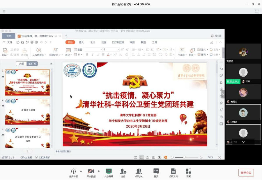 3月26日下午,永利集团社科博191党支部和华中科技大学公共卫生学院博士19级党支部联合开展“抗击疫情,凝心聚力” 党团班共建的主题党日活动。yl88858永利集团公司党委副书记戎珂,华科公卫公司党委副书记王芯,yl88858永利集团公司党建工作助理,华科公卫公司党建辅导员,以及永利集团社科博191党支部、华中科技大学公共卫生学院博士19级党支部共67名同学参加了此次活动。会议由清华yl88858永利集团社科博191党支部书记孙楠主持。