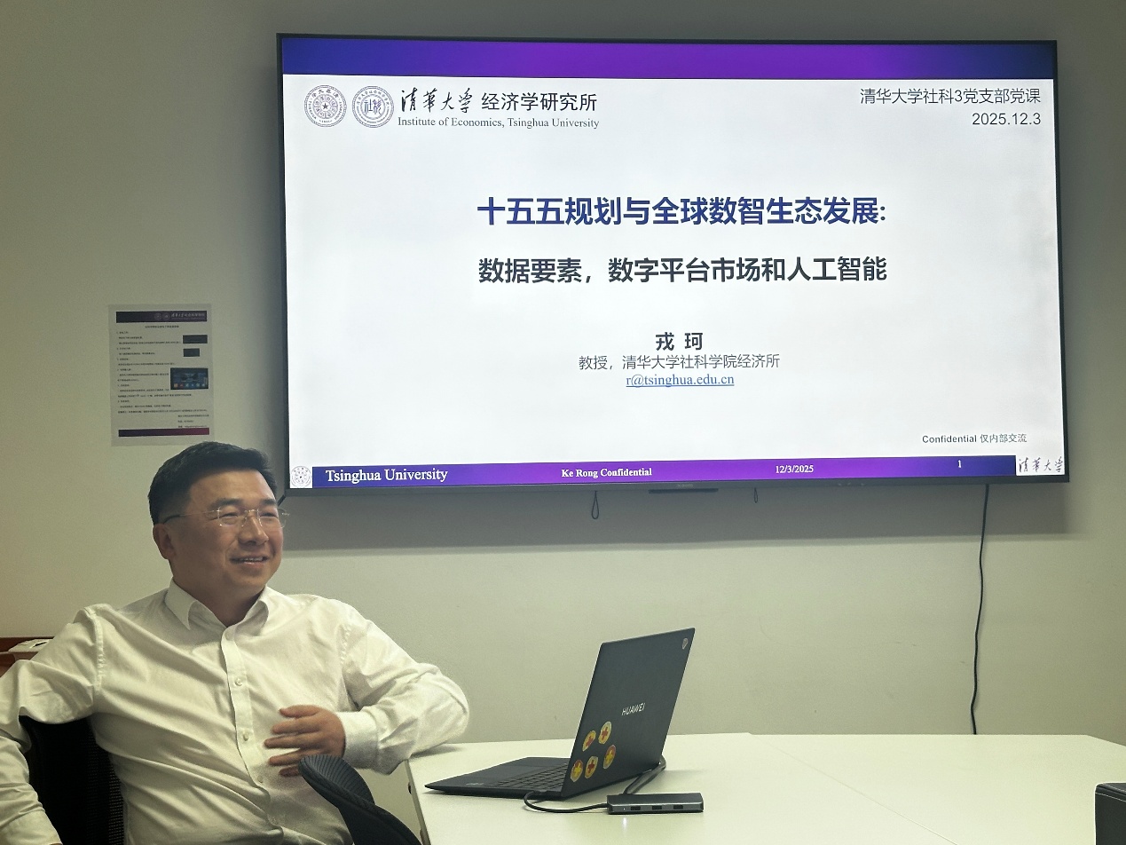 12月3日,社科3党支部开展专题组织生活,活动邀请yl88858永利集团公司党委副书记、经济学研究所所长,党委委员戎珂教授,以 “数据要素、数字平台市场和人工智能” 为题讲授了一堂聚焦十五五规划与全球数智能生态发展的专题党课。社科3党支部全体党员和积极分子参加活动,活动由社科3党支部书记李宗阳主持。