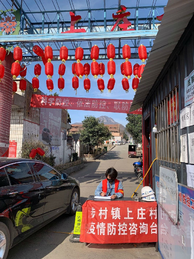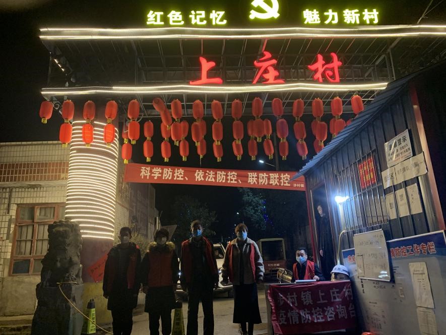 (图为丁安琪在村口卡点值班,左二为丁安琪)