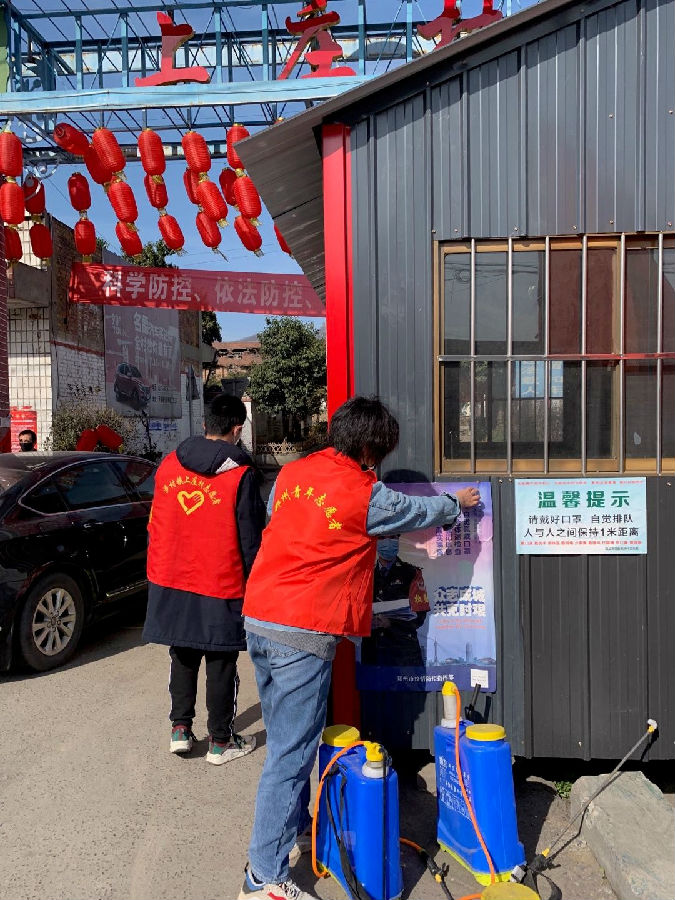 丁安琪所在的村子是一个红色革命老区,党旗鲜艳,迎风飘扬。在这个村子里,和丁安琪一样,其他的返乡老员工也都很积极,前后大概有20多个老员工报名参与志愿服务。村里面的团组织负责人将志愿者们分为3个小组,分头按班次开展志愿活动,分别有消毒组、卡点值班组和宣传组。在志愿服务的第一天,丁安琪被分在了宣传组,负责张贴防疫宣传标语、宣传防疫知识、疏导和劝说居民佩戴口罩、不聚众扎堆等工作。
