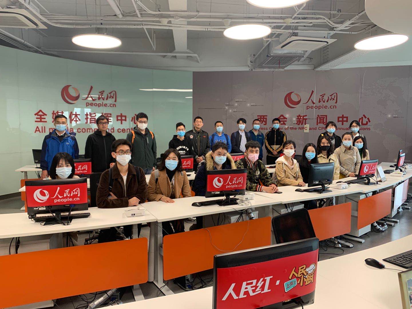 随后,同学们参观了人民网演播厅、导播间,以及全媒体指挥中心,两会新闻中心。同学们于此拍照留念,身临其境地感受在人民网工作的状态与心情。