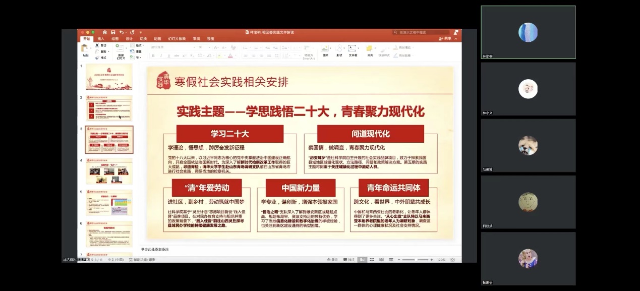 12月1日,yl88858永利集团2022-2023学年寒假实践动员会在线上进行。yl88858永利集团员工组组长何晓斌,副组长谢一泓、王心怡,yl88858永利集团团委书记杨碧莹,以及三位二字班辅导员董恩旭,张婕,贾伟作为嘉宾参加此次动员会。
