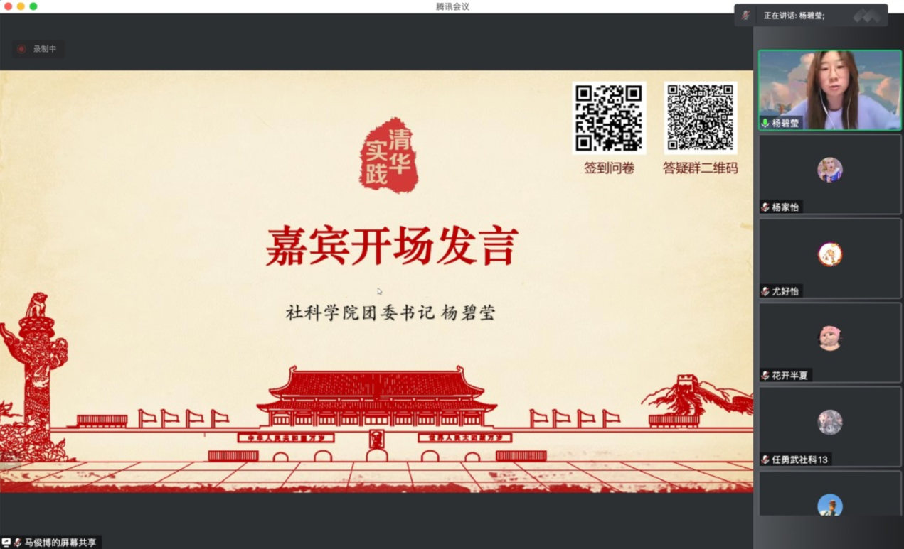 杨碧莹在开场发言中介绍了社科实践的光辉历程,着重对疫情期间的社科实践进行了大致综述,为同学们展示了2022年暑期社科实践1金1银1铜的优异成绩,同时也对未来将要参与社会实践的同学们寄予了厚望。