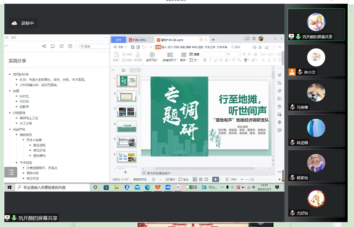 本次动员会邀请了两位社科实践人为同学们讲述她们的实践故事。作为一名拥有丰富实践经验的“九字班”,巩开颜学姐为大家带来了主题为《在地实践经验分享:以地摊经济调研为例》的展示,为同学们详细介绍了自己在过往实践中的经历与经验,也为大家提供了中肯且实用的建议。社会学系博士生欧芃瑞学姐也热情地参加了此次动员会,为同学们作了题为《山海情:从戈壁滩到金沙滩的人间奇迹》的展示,带领同学们一起回顾了自己的研究生优秀实践项目。喜看稻菽千重浪,遍地英雄下夕烟,如此的实践经历和实践精神令在场同学为之动容。