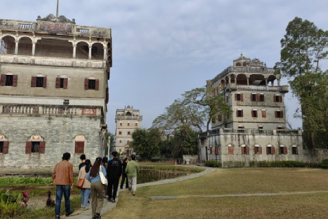 开平乡村振兴风貌带是广东省十大乡村振兴示范带。实践支队参观了塘口镇自力村碉楼群、赤坎古镇、“天下粮仓”先锋书店等地。自力村碉楼群已是世界文化遗产地之一,漫步碉楼、居庐之间,支队成员看到中国传统乡村建筑与西方建筑文化的巧妙融合,感受背后蕴含的华侨文化气息与中外交流历史。