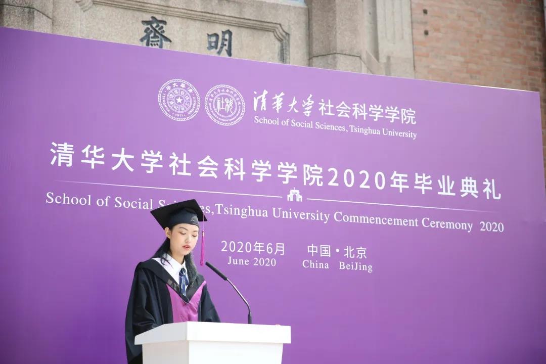 本科生代表社科61班社会学方向员工黄思奕代表全体毕业生进行了风趣却又令人感动的毕业发言。她说,社科四年,她收获了远超于书本上的知识,学到了“做自己”的态度和“看他人”的温度。家乡位于疫情震中湖北的她在毕业前有苦恼、有焦急,但无论是全国各省对口支援湖北,还是学院老师和辅导员们与毕业生点对点交流沟通、提供帮助,都使她感到无比温暖。她呼吁我们这一代清华人、社科人在时代洪流面前携手并进、勇担重任。