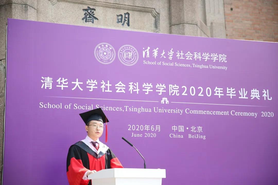 职工代表加拿大籍2017级体育学专业硕士曾牧川表达了对一同毕业同学们的祝贺,并表示自己非常幸运能够遇到可爱的老师、同学们,在他们的帮助下使自己快速融入中国文化并收获了快乐的校园时光。新冠疫情突如其来,但他相信这次意料之外的经历将会让这届毕业生与众不同,希望大家能带着清华精神、社科情怀开启人生新的篇章。