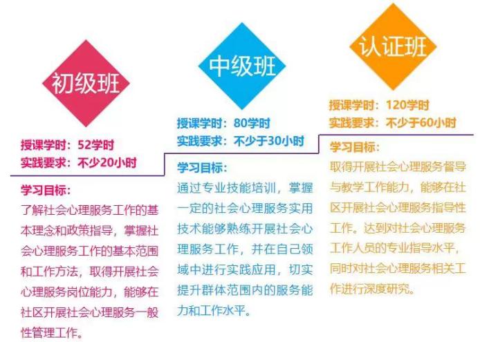 永利集团社会心理服务指导师课程分为三阶:初级基础班、中级实践班、认证班。初级基础班,主要培养社会心理服务工作的基础服务人才。