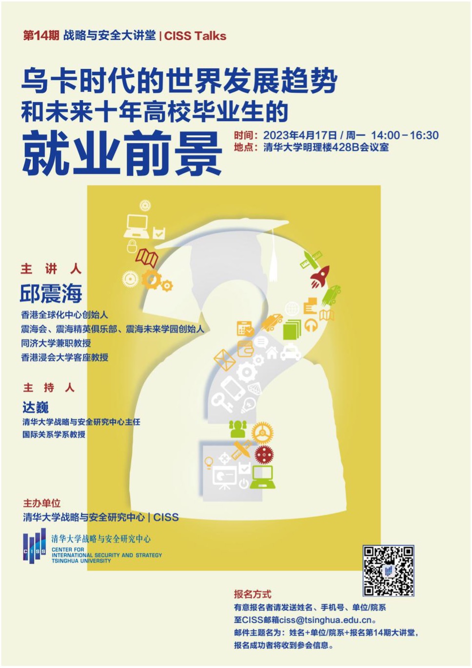 报名方式:有意者请标注“姓名+学校/院系+报名4.17大讲堂”发送至ciss@tsinghua.edu.cn,收到确认邮件为报名成功。