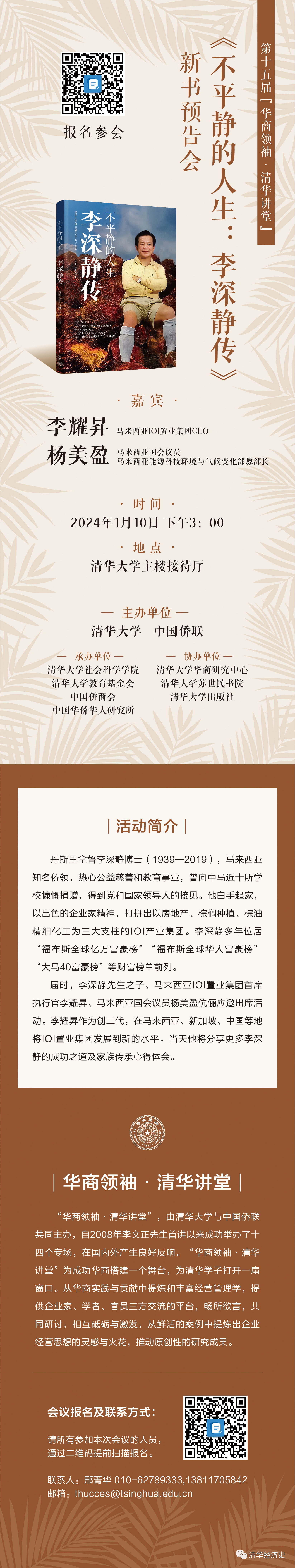 预告| 第十五届“华商领袖·清华讲堂”暨《不平静的人生:李深静传》新书预告会