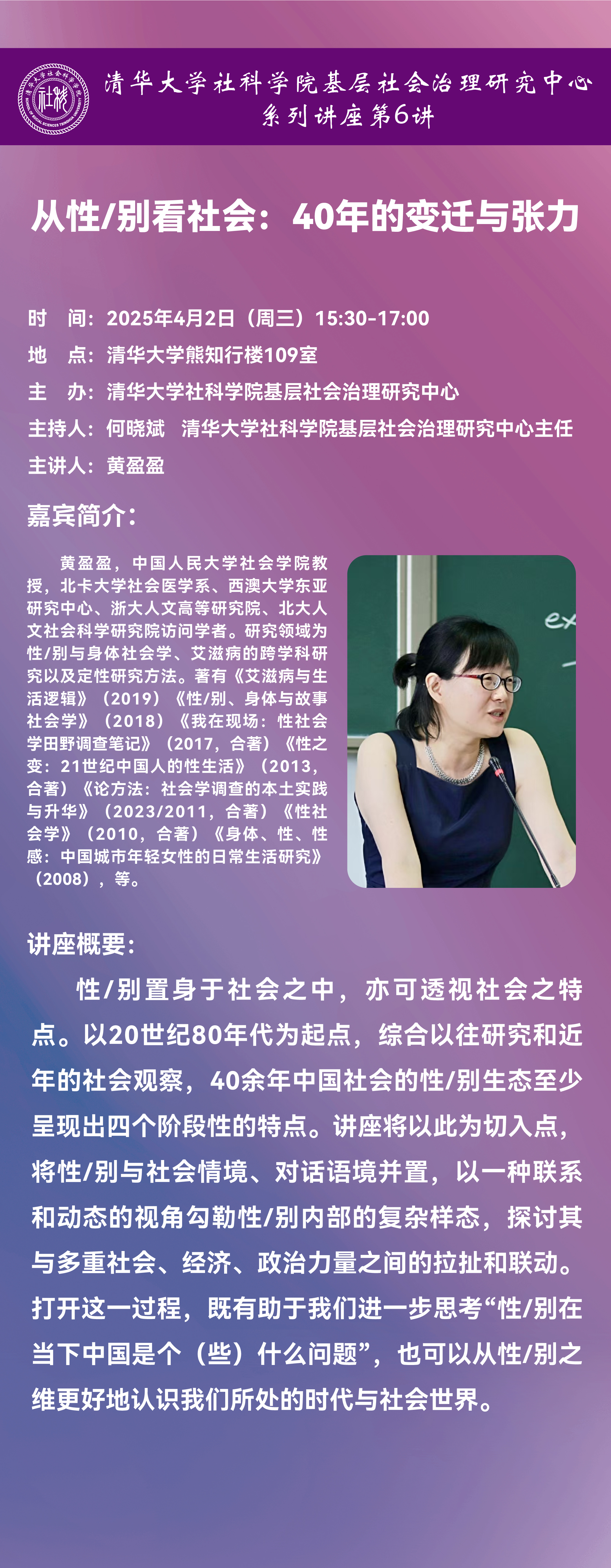 性/别置身于社会之中,亦可透视社会之特点。以20世纪80年代为起点,综合以往研究和近年的社会观察,40余年中国社会的性/别生态至少呈现出四个阶段性的特点。讲座将以此为切入点,将性/别与社会情境、对话语境并置,以一种联系和动态的视角勾勒性/别内部的复杂样态,探讨其与多重社会、经济、政治力量之间的拉扯和联动。打开这一过程,既有助于我们进一步思考“性/别在当下中国是个(些)什么问题”,也可以从性/别之维更好地认识我们所处的时代与社会世界。