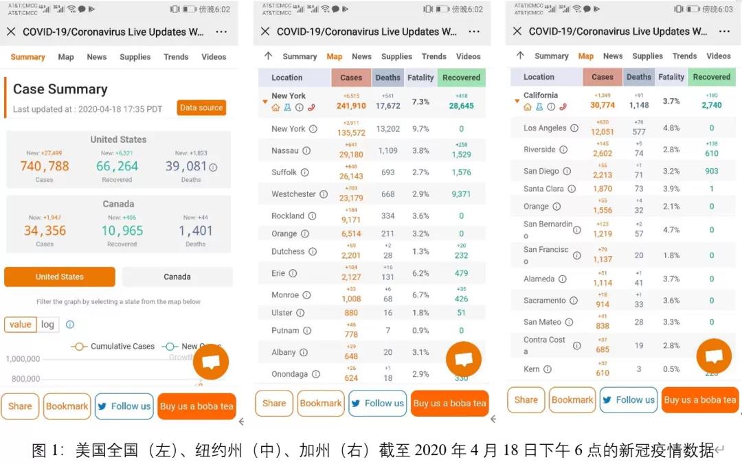 我于1月上旬前往美国加州旧金山,那时加州的机场和海关还没有采取任何预防和筛查措施,美国社会对此次新冠疫情的了解基本处于未知状态。到了1月中下旬,武汉的疫情开始显现,1月23日武汉“封城”,我就意识到中国疫情的严重性。1月20日,美国华盛顿州确诊一名新冠肺炎患者,但在当时没有引起美国政府的足够重视,总统特朗普对此的态度基本是将之视作“大号流感”,彼时美国民众的生活尚未受到疫情的影响,上班、上学和各种集体活动照常进行。我因中国疫情一天天加重而感到忧心忡忡,美国的华人社群也开始纷纷组织力量捐钱、捐物给中国,当时我去美国超市已经不容易买到口罩了。1月31日,美国宣布自2月2日起禁止来自中国的外国人入境,这时欧洲的疫情也在逐步蔓延,世界卫生组织已经警告疫情会在全世界快速扩散,但美国政府和整个社会还是处于不重视疫情的状态,对中国疫情采取观望态度。果然,美国疫情的社区传播很快就开始了,报告病例最多的先是华盛顿州,然后就是纽约州和加州等人口大州。经过了近两个月,特朗普才有点紧张起来,在3月13日召开新闻发布会,正式宣布全国进入紧急状态,并宣布一系列应对措施,如对于中小企业的贷款,对困难民众的补贴等。发布会上让我印象比较深刻的是,美国总统召集了互联网公司(如谷歌)、大型超市(如沃尔玛)和生物科技公司,宣布要合作抗疫。由谷歌公司开发平台对疑似病人进行症状筛查,确定是否需要去医院就诊,全美设立开车(Drive-Through)检验点,加快监测设备和试纸的开发,限制对养老院等场所的访问,从这时候开始美国才真正全国行动起来对抗疫情。随着检测能力的大幅度提升,美国确诊人数和死亡人数以每隔几天就翻倍的速度快速增长。截止到4月18日,美国确诊人数为740788人,死亡39081人,在一个月的时间里成为全世界确诊人数和死亡人数最多的国家。这当然跟美国联邦政府应对不够及时、行动迟缓有很大关系,但更重要的是美国的政治体制和社会文化使得美国不可能采取和中国一样严厉的“封城”和社区隔离措施。