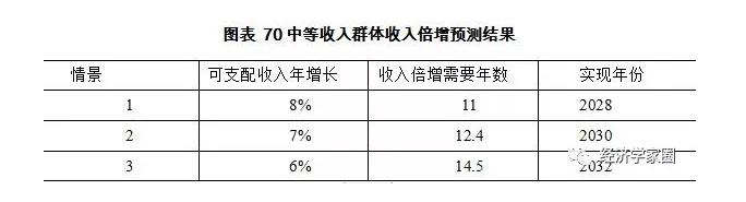 新增4亿中等收入群体,需要将目前处于中等偏下收入和中等收入群体中年收入不足10万元的家庭的年收入提高到10万元以上。假设未来一段时间居民可支配收入每年分别按照8%、7%和6%的速度增长(实际收入增长分别为6%、5%和4%,物价增长2%),在假设出生率不变的情况下,实现中等收入群体人数倍增分别需要11,12.4和14.5年。也就是说,以2017年为基年,在6%的居民可支配收入年增长假设下,我国有望在十五年,换言之三个五年计划内,实现中等收入群体数量倍增。