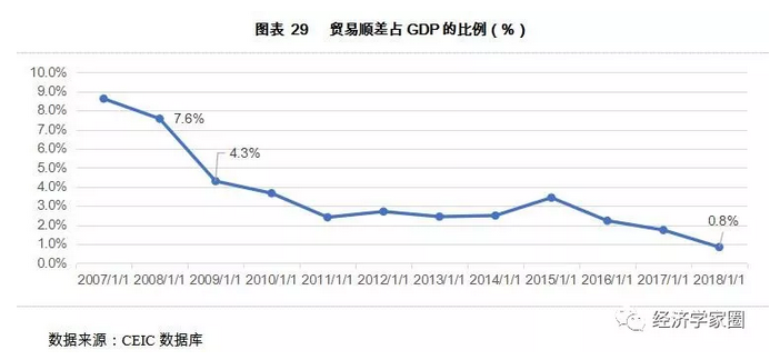 自2008年金融危机以来中国的国际收支逐步改善,经常账户顺差占GDP的比例逐步缩小。然而,随着近年来服务贸易逆差的扩大与货物贸易顺差的缩小,中国的经常账户顺差逐步缩小。