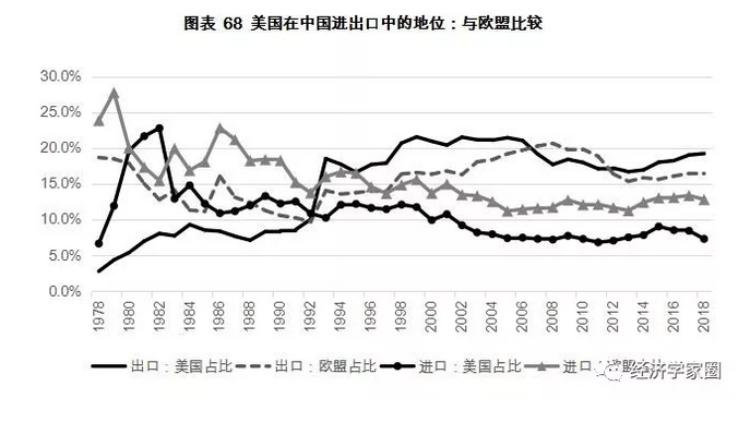 从中国的视角,在中国出口总量中,美国从1978年的2.8%增长到2018年的19.2%,尤其是90年代,美国地位迅速提高,1992-1998年仅6年内美国占比从10%增长到20%以上。在中国进口总量中,美国经历了80年代初期的“高峰”(美国占比曾高达22.8%)后,地位逐渐下降,2018年从美国进口约占中国进口总量的7.3%。