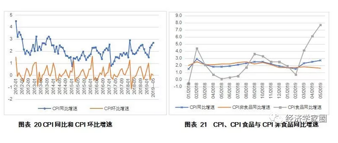 从环比看,消费者价格水平与上期持平。2019年5月CPI环比增速为0,比4月0.1%的环比增速下降了0.1个百分点。其中,CPI食品价格上涨0.2%,影响CPI上涨约0.03个百分点;CPI非食品价格与上期持平,说明工业品和服务价格总体上没有形成上涨的动能。根据国家统计局数据,在CPI食品中,鲜果价格环比上涨10.1%,影响CPI上涨约0.20个百分点,去年水果库存下降导致市场供应减少,导致水果价格的上涨。而随着鲜菜的大量上市和供给增加,鲜菜价格下降,鲜菜价格环比下降7.9%,影响CPI下降约0.22个百分点。在CPI非食品价格中,汽油和柴油价格上涨合计影响CPI上涨约0.04个百分点。