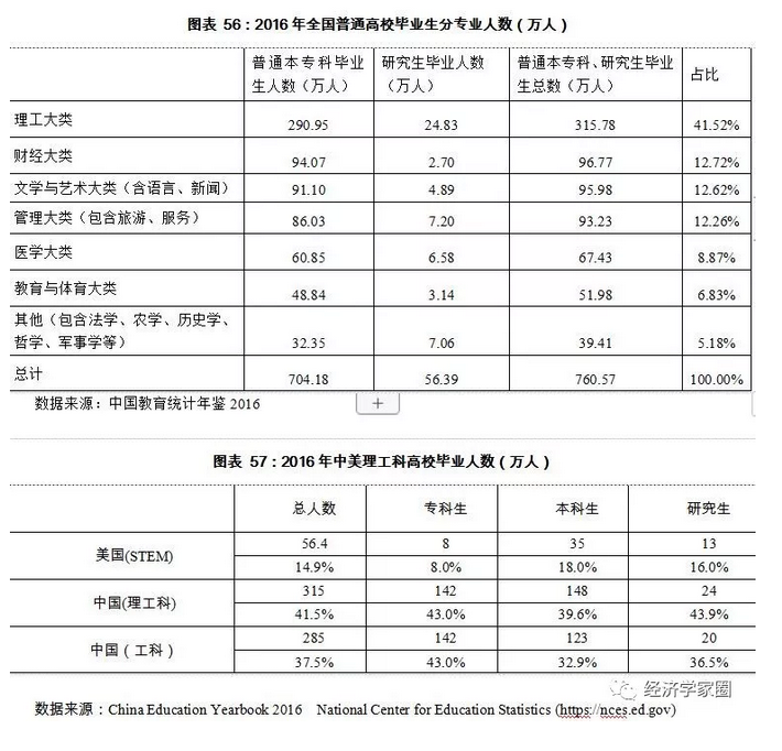 同时,应注意到经过中国教育长期的改革和发展,中国高校培养出的高素质人才不断增多,为中国积累了良好的人力资本优势。根据2016年《中国教育统计年鉴》的数据,2016年全国普通高校本专科、研究生毕业生总数760.57万人,其中理工大类毕业生315.78万人,占比41.5%,仅工科毕业生人数就达285万人,占比37.5%。相比之下,2016年美国理工科高校毕业生总人数为56.4万人,占全部毕业生比例仅14.9%,理工科人才培养规模和占比均远低于中国。规模庞大的理工科毕业生将直接贡献中国的科技劳动力积累,为科技创新提供坚实基础,有力支撑着中国的技术进步和产业升级,助力中国在部分科技领域领跑世界。