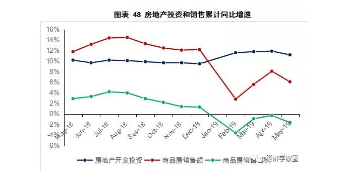2019年以来,固定资产投资总体平稳增长,但和GDP增速比较来看,固定资产投资增速仍整体偏低。2019年1至5月,固定资产投资累计同比增长5.6%,增速较去年同期和今年前4个月均下降0.5个百分点,较去年全年下降0.3个百分点。其中,制造业投资增速骤然下滑,前5个月同比增长仅为2.7%,较去年同期下降2.5个百分点,较2018年全年下降6.8个百分点;基建投资同比增长4%,虽较去年同期的9.4%相比仍处低位,但结束了2018年下半年来的下滑趋势,已基本企稳;房地产投资同比增长10.9%,较去年同期提升3.2个百分点,较2018年全年提升2.6个百分点,在一定程度上起到了稳投资的作用。因此,从数据上看,2019年以来固定资产投资方面最严重的问题来自制造业投资。
