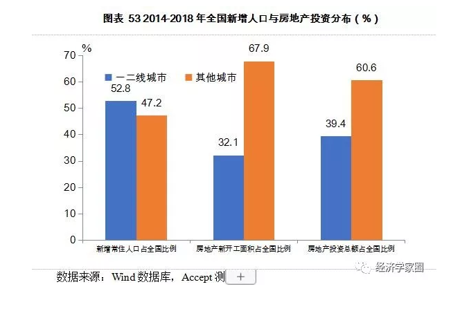 二线城市:天津、重庆、杭州、南京、武汉、沈阳、成都、西安、大连、青岛、宁波、苏州、长沙、济南、厦门、长春、哈尔滨、太原、郑州、合肥、南昌、福州、石家庄,共23个。]城市面临新增人口多、新增住房少的局面。根据我们的计算,2014-2018年,全国一二线城市新增常住人口约1829万人,三四线城市新增常住人口1637万人,分别占全国的53%和47%。但是与之形成对比的是,同期,一二线城市房屋新开工面积占全国的32%、房地产投资总额占全国的39%。