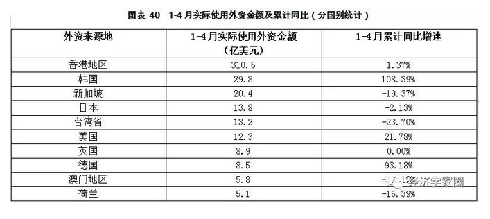 贸易摩擦以来,从实际使用外资金额的数据来看,中国维持了去年以来的稳定增长态势。今年1-5月我国实际使用外资546.1亿美元,同比增长3.7%(未含银行、证券、保险领域数据),在全球外国直接投资持续下降的背景下逆势增长。从商务部公布到1-4月份来华直接投资前十位的国家/地区数据来看,香港、韩国、新加坡、日本、美国、英国、德国对华投资分别增长1.4%、108.4%、-19.4%、-2.1%、21.8%、0.0%和93.2%。