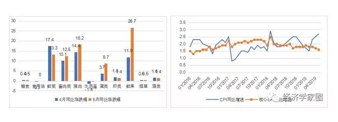 在CPI八大类中,只有交通和通信项呈现负增长的态势,其增速为-0.9%,而其他六类指数都呈现出同比上涨的趋势。2019年5月份,不包括食品和能源的CPI(核心CPI)同比上涨1.6%,延续2019年1月以来的下滑趋势,说明消费和投资需求增速的下降,对核心CPI形成一定的向下压力。