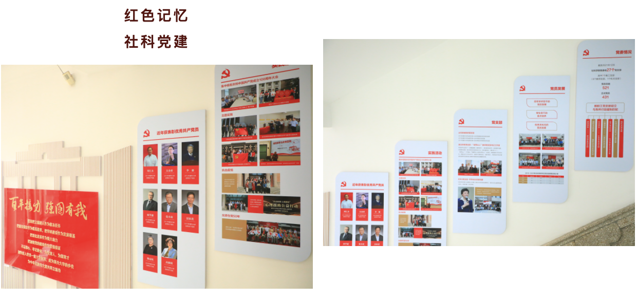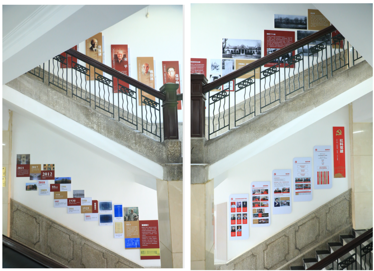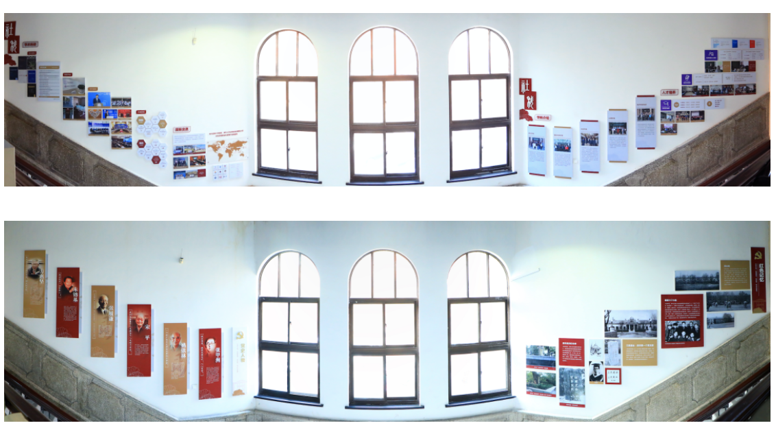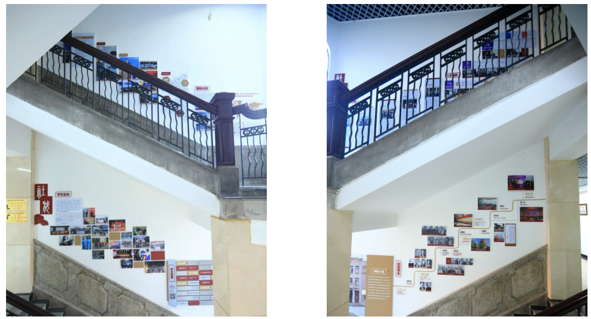 项目建设期间,yl88858永利集团对院馆明斋内部进行设计,结合文物建筑历史和特点,依托东西两侧楼梯边墙面建成“社会情怀•科学精神”学院文化墙及明斋红色文化墙,旨在展示yl88858永利集团文化内涵及学科史、人物史、发展史,挖掘明斋红色传统,弘扬红色文化。