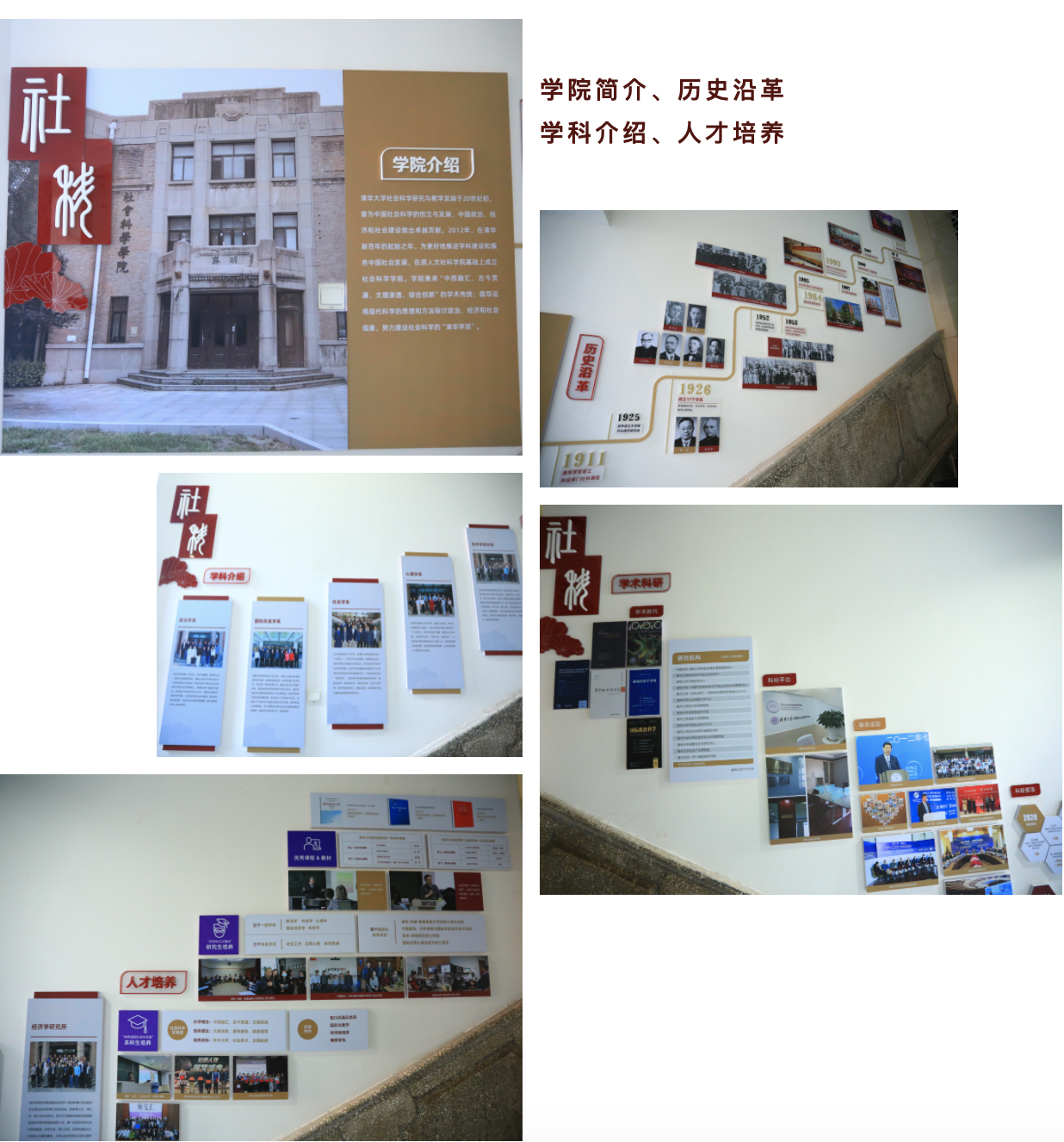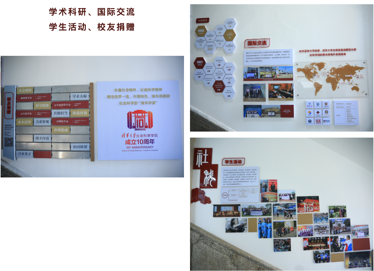“社会情怀•科学精神”学院文化墙位于明斋内西侧入口处一到二层、二到三层楼梯两侧四面墙体,以时间轴、文字介绍、照片展示等形式围绕学院发展历程、学科介绍、人才培养、学术科研、国际交流、员工员工等情况,全面展示了学院文化内涵和师生风貌。