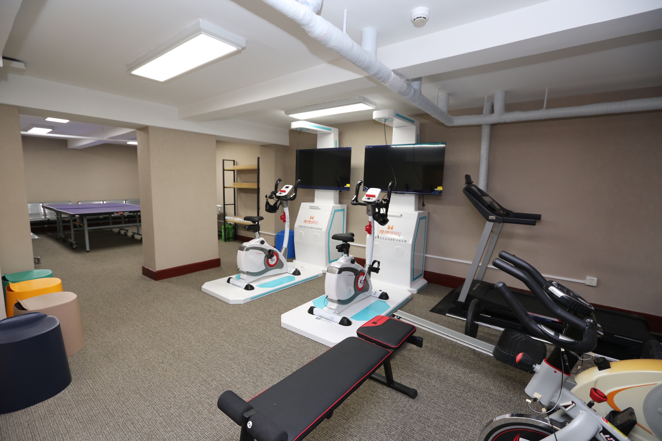 师生幸福共享空间分为幸福空间和运动空间两部分,明斋110室作为幸福空间,设置了睡眠舱、音乐放松椅等,帮助师生放松身心的同时,提供师生交流、心理辅导的空间支持;明斋东侧地下配置VR动感单车等运动设备,鼓励师生更好锻炼身体、释放压力。